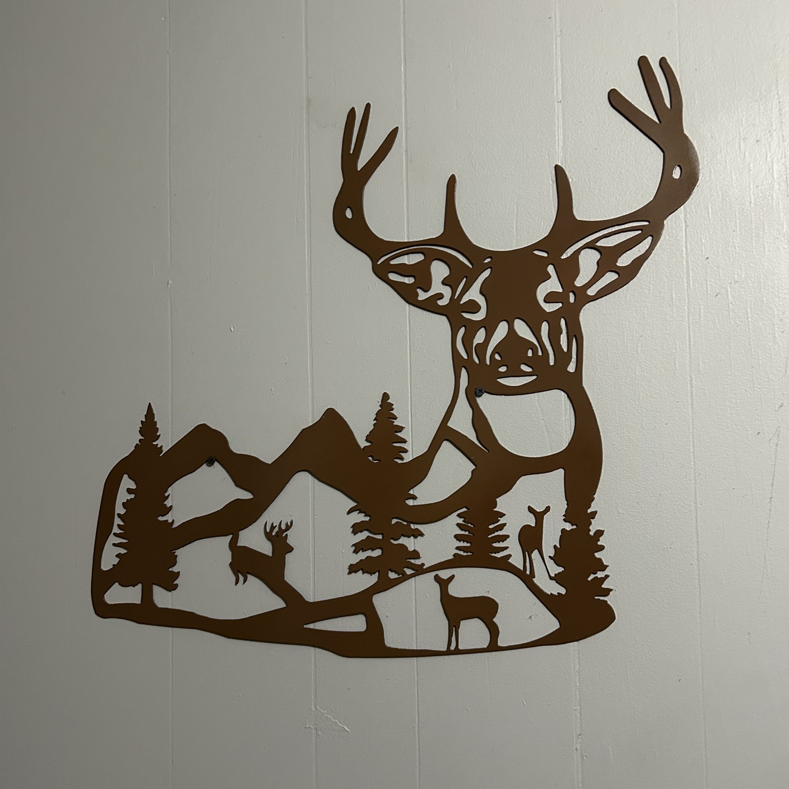 Buck silhouette with mountains inside. Made from 11g steel and measures 24″ x 22″. Perfect for any outdoors person and please be sure to pick you color of paint or the powder coating option!