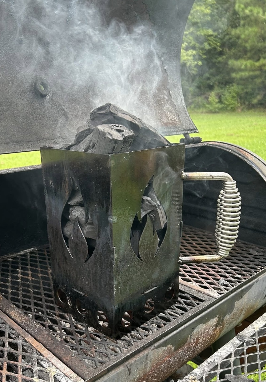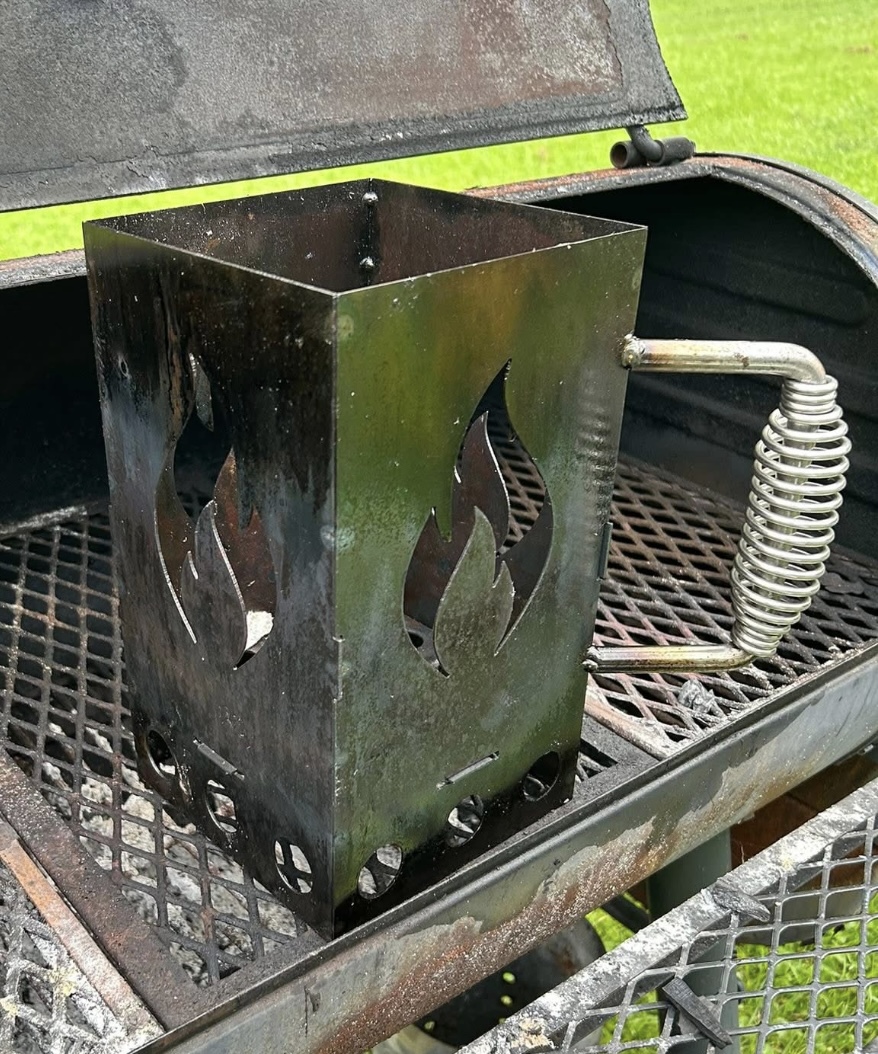 Simple and easy to use charcoal chimney. Holds about 5lbs of charcoal. Made from Cold Rolled Steel 16ga with welded “cool grip” style spring handle. Maintenance instructions included with each Chimney to ensure these last more than just one season like most other starters on the market.