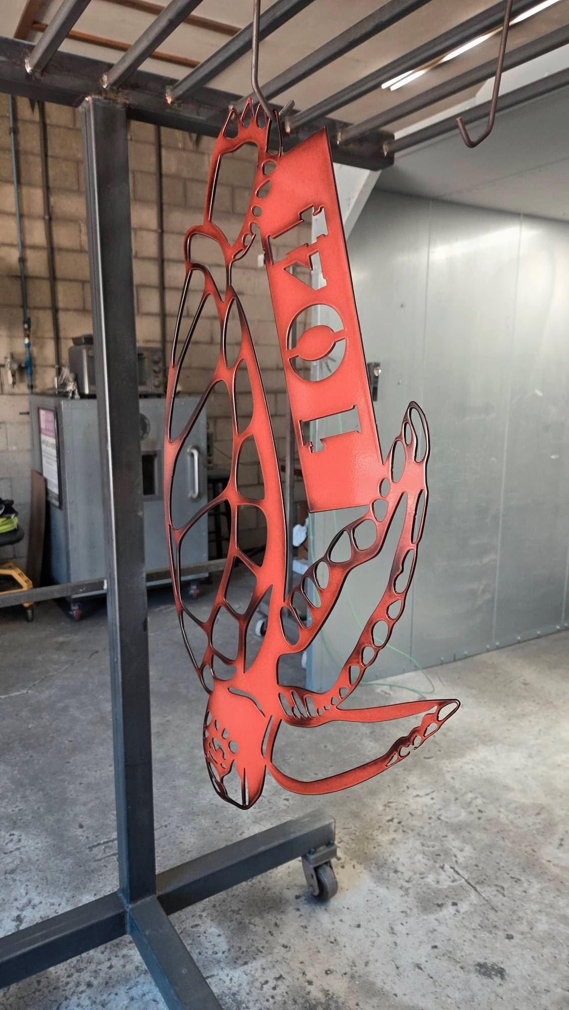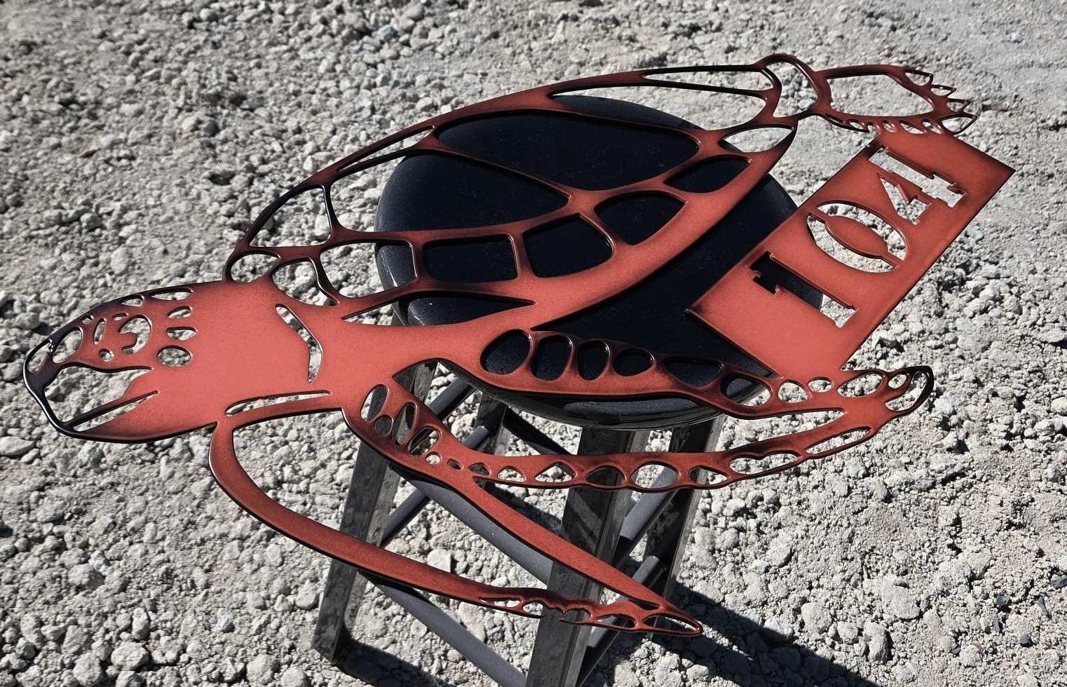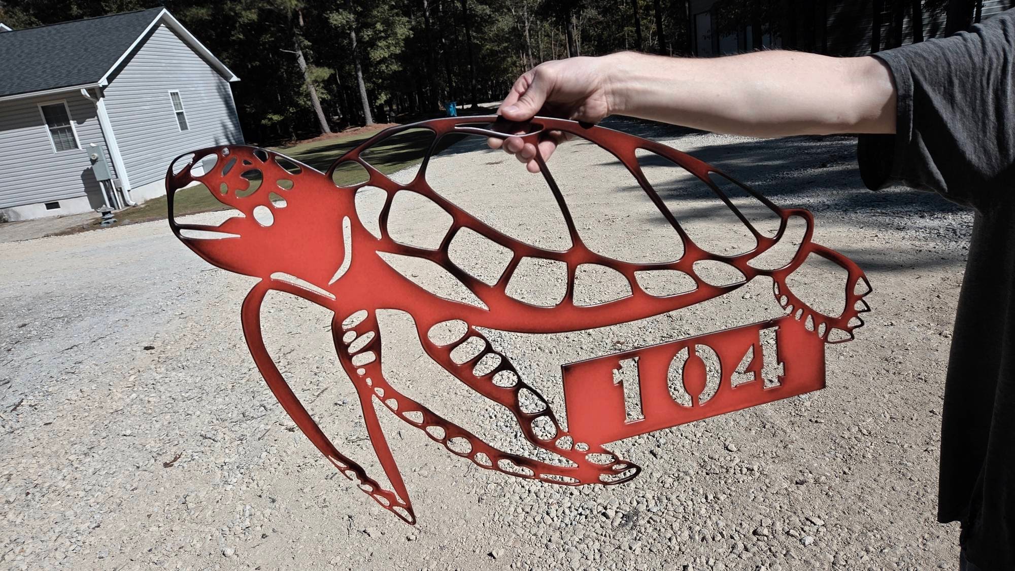 Sea Turtle with your street number OR name on the bottom!  Perfect for your beach house, cottage, rental trailer on the water or just anywhere you would like.  Make sure to tell us what you want cut out and weather you will want paint or powder coating.  size is 33″x 20″ and cut from 11ga steel. (shown is a salmon color powder coat with black edges for depth and clear coat.)
