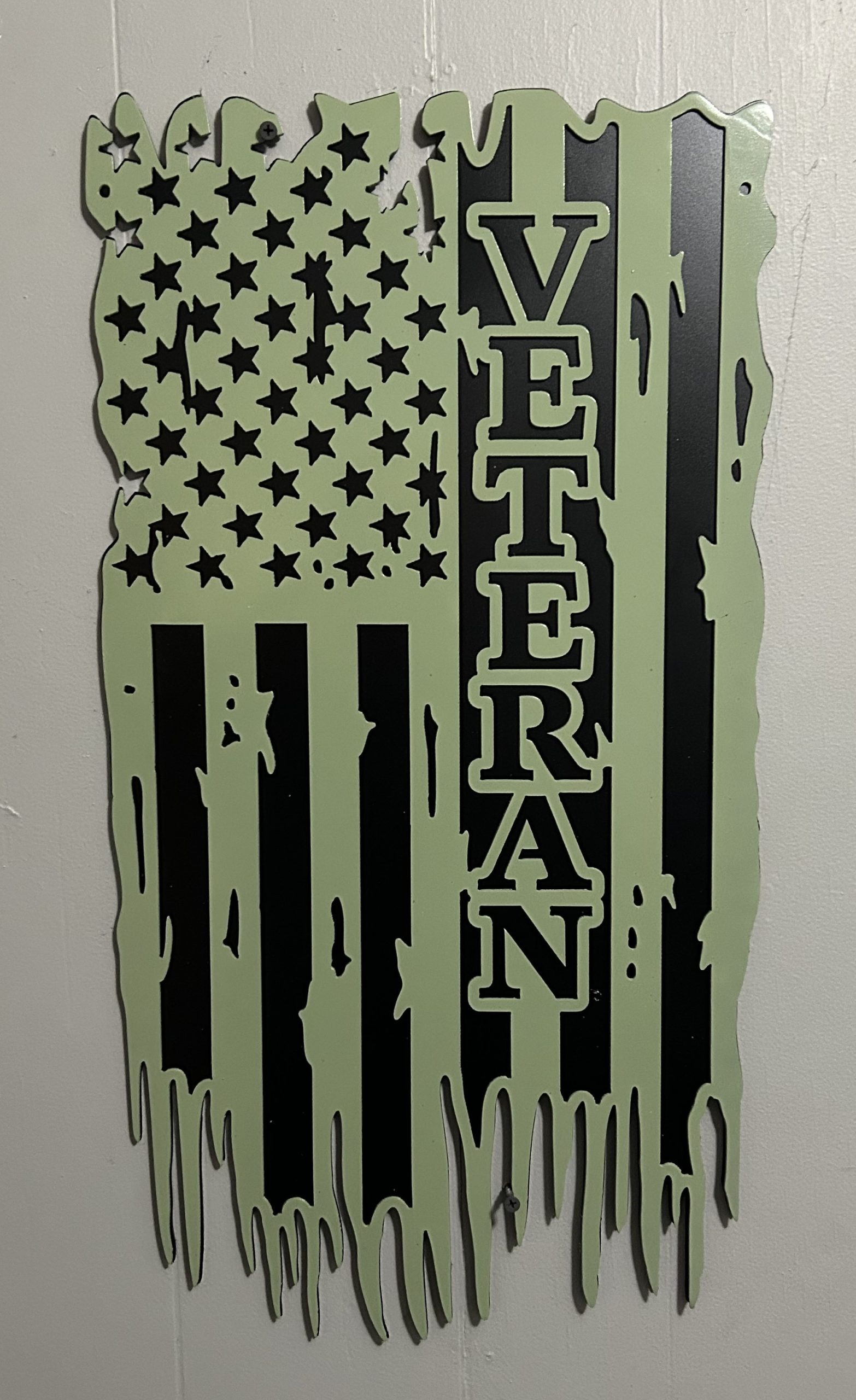 Veteran Tattered flag hangar. Made from 2 pieces of steel painted or powder coated to your choosing! (Pictured is OD green and black). Size is 25″ x 13″ and uses both 11g and 16g thick steel.