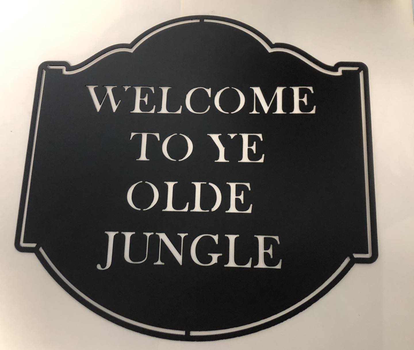 Vintage sign “Welome To Ye Olde Jungle”. Antique style paint.